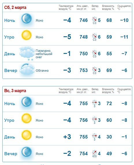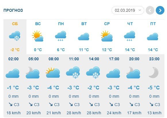 Gismeteo обещает небольшой снег днём субботы, 2 марта. Всё остальное время – без осадков. Минимальная прогнозируемая температура воздуха – -5°С, максимальная – +3°С.