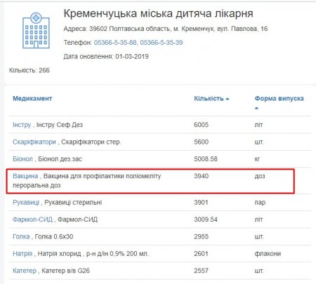 На Полтавщині маємо сервіс «Доступні ліки» на основі таких даних: вводите назву лікарні – і - опа, дивитесь усе, що там є. Наприклад, ми дізналися, що в Кременчуцькій міській дитячій лікарні станом на 1.03.19 є 3940 доз вакцини від поліомієліту, і багато чого іншого.