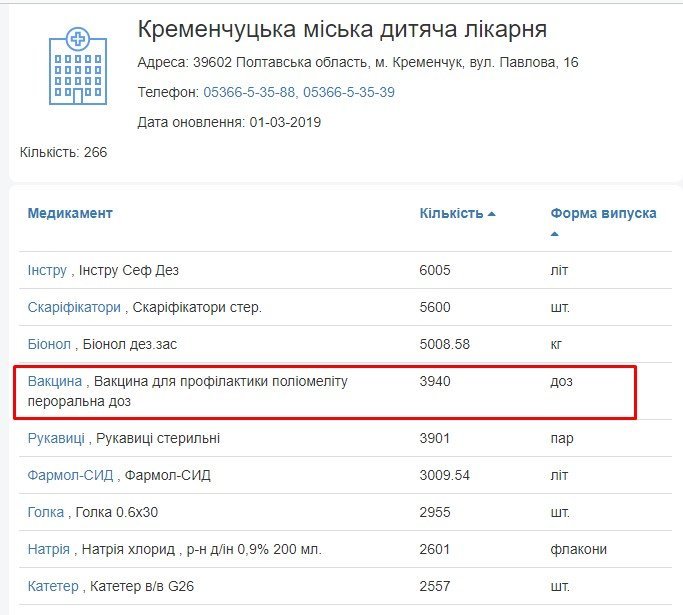 На Полтавщині маємо сервіс «Доступні ліки» на основі таких даних: вводите назву лікарні – і – опа, дивитесь усе, що там є. Наприклад, ми дізналися, що в Кременчуцькій міській дитячій лікарні станом на 1.03.19 є 3940 доз вакцини від поліомієліту, і багато чого іншого.