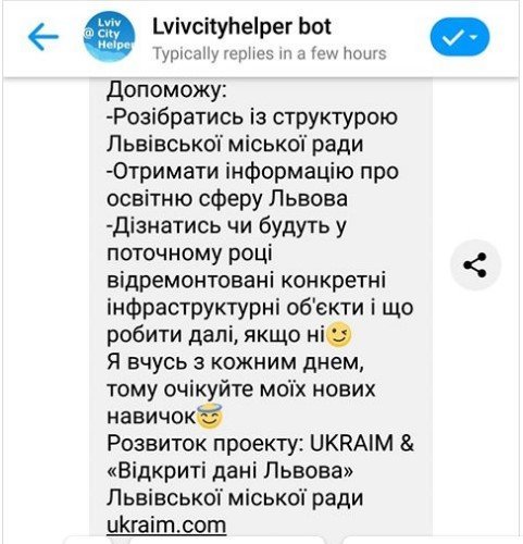 Дивіться, наприклад, який корисний Lvivcityhelper bot – працює для львів’ян, допомагаючи розібратися із міськими даними про благоустрій, освіту, медицину, і навіть записатися на прийом до чиновників. І все – однією кнопочкою у меседжері Фейсбук. Нам би щось таке, правда?