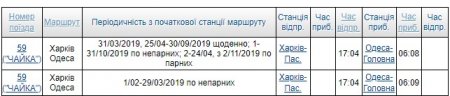Фирменный поезд «Чайка» № 59/60 сообщением Харьков-Кременчуг-Одесса в зимнее время курсирует через день, а летом – ежедневно. До 31 марта этот поезд из Харькова на Одесу будет курсировать по нечетным дням, а с 2 по 24 апреля – по четным. Из Одессы в Харьков до 30 марта этот поезд будет отправляться по четным дням, а с 1 по 25 апреля 2019 – по нечетным.