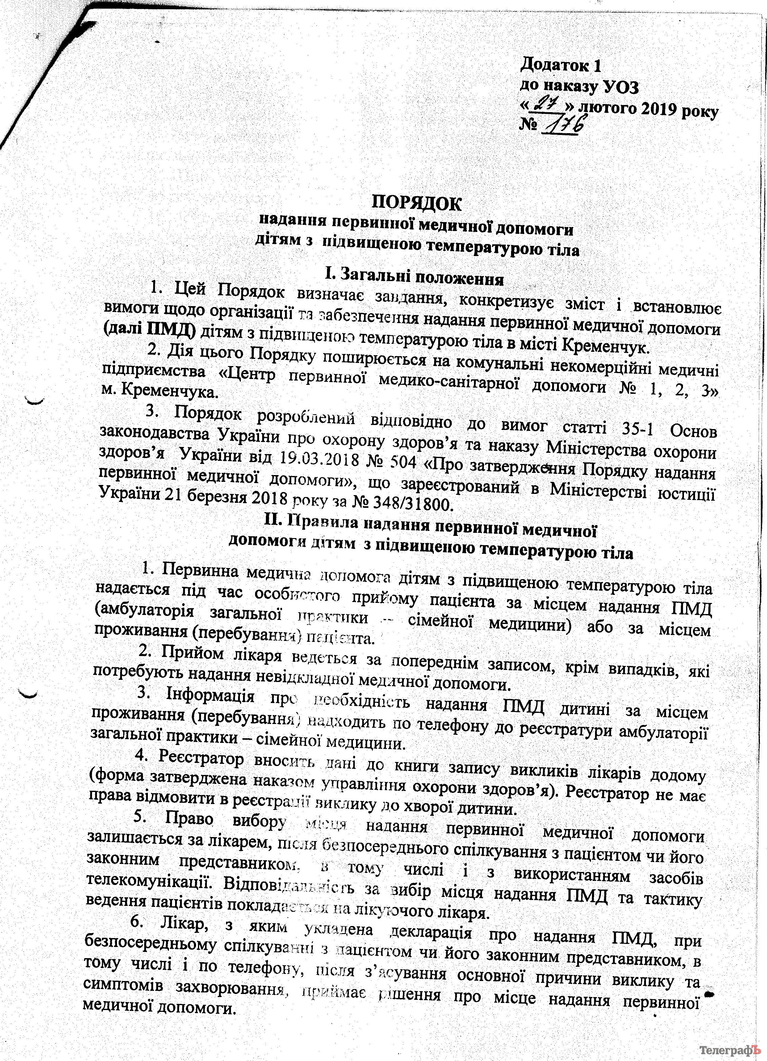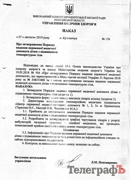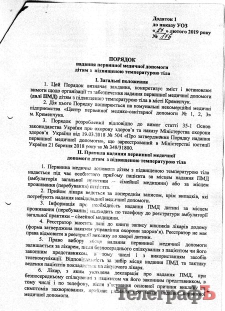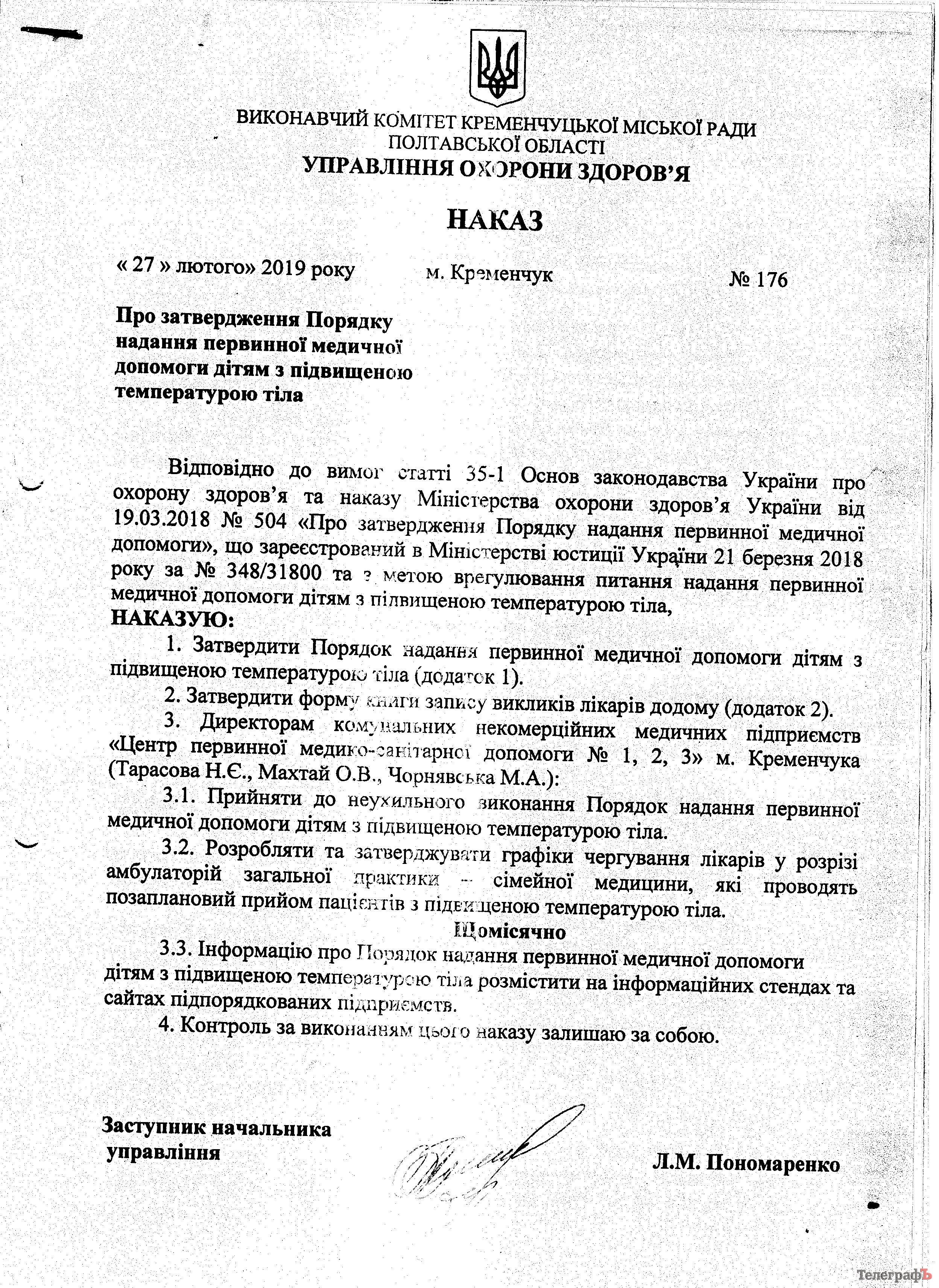 От Супрун пока ответ не пришел. А вот Кременчугское управление здравоохранения под давлением депутатов все-таки разработало новый Порядок оказания первичной медпомощи детям с высокой температурой. Этот Порядок утвержден приказом №176 по горздраву, так что теперь он обязателен к исполнению в кременчугских детских медучреждениях первичного уровня – ЦПМСП №№ 1,2,3.