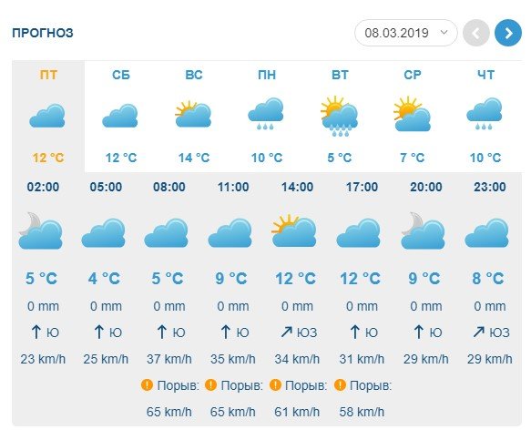 За прогнозом Ventusky, увесь день п’ятниці, 8 березня, небо буде хмарним, повітря прогріється до +12°С, а пориви вітру сягнуть 18 м/с.