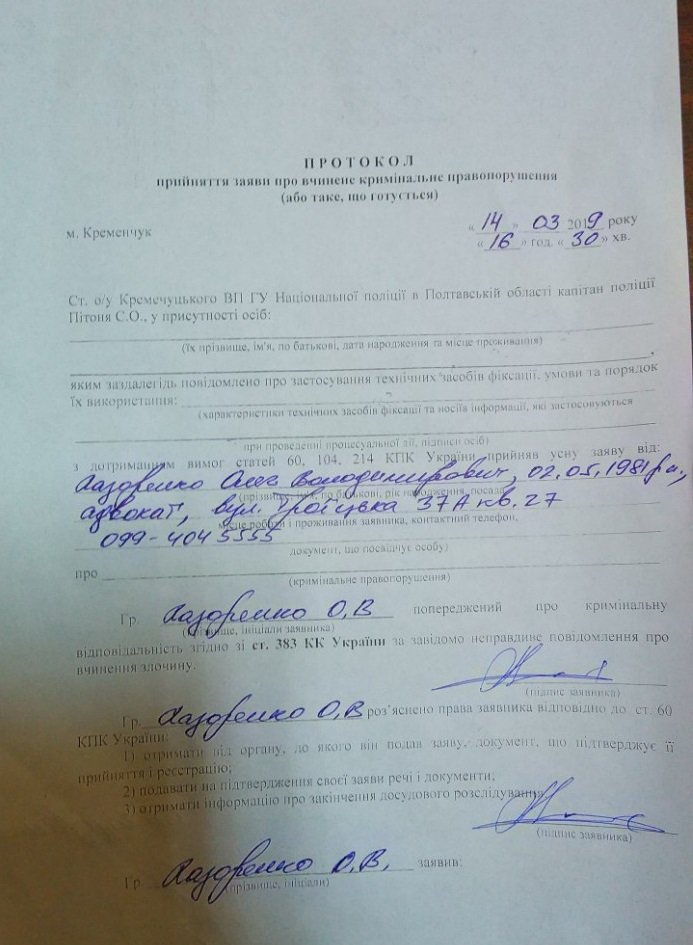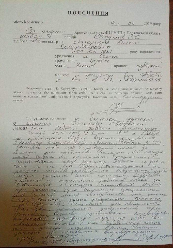 По словам адвоката, он оформлял документы для того, чтобы проголосовать не по месту регистрации. Также Олегу Лазоренко не понравилось то, что в отделе людям не делают копий документов, а посылают делать их самостоятельно за деньги.