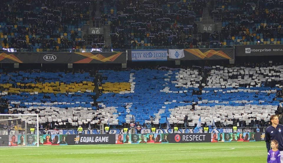 Ультрас «Динамо» перед матчем 1/8 фіналу Ліги Європи проти «Челсі» на НСК «Олімпійський» під час виходу команд на поле на двох секторах вболівальники утворили величезний прапор ВМС України. Яскравий перфоманс влаштували на підтримку полонених в Росії українських моряків.