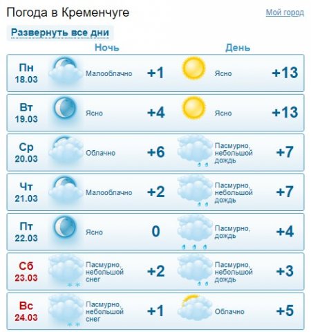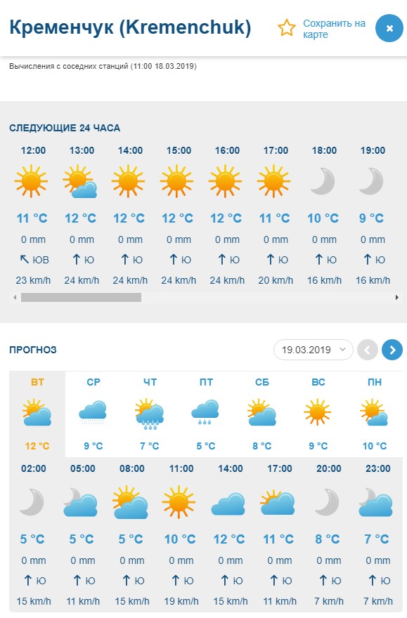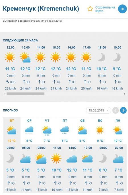 На rp5 крім дощу з середи, 20 березня, по п'ятницю, 22 березня, кременчужан попереджають ще й про пориви вітру до 13 м/с у понеділок-вівторок, 18-19 березня, та ранковий серпанок щодня з середи, 20 березня, по суботу, 23 березня.