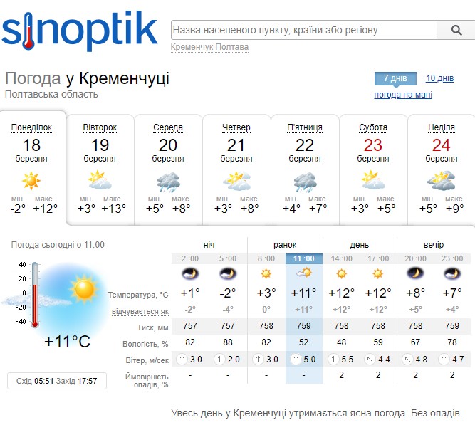 Схожий температурний прогноз і на Sinoptik. Але дощ нам тут обіцяють у середу, 20 березня, та п'ятницю, 22 березня.