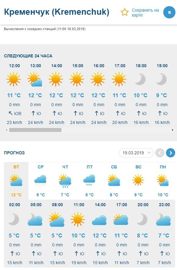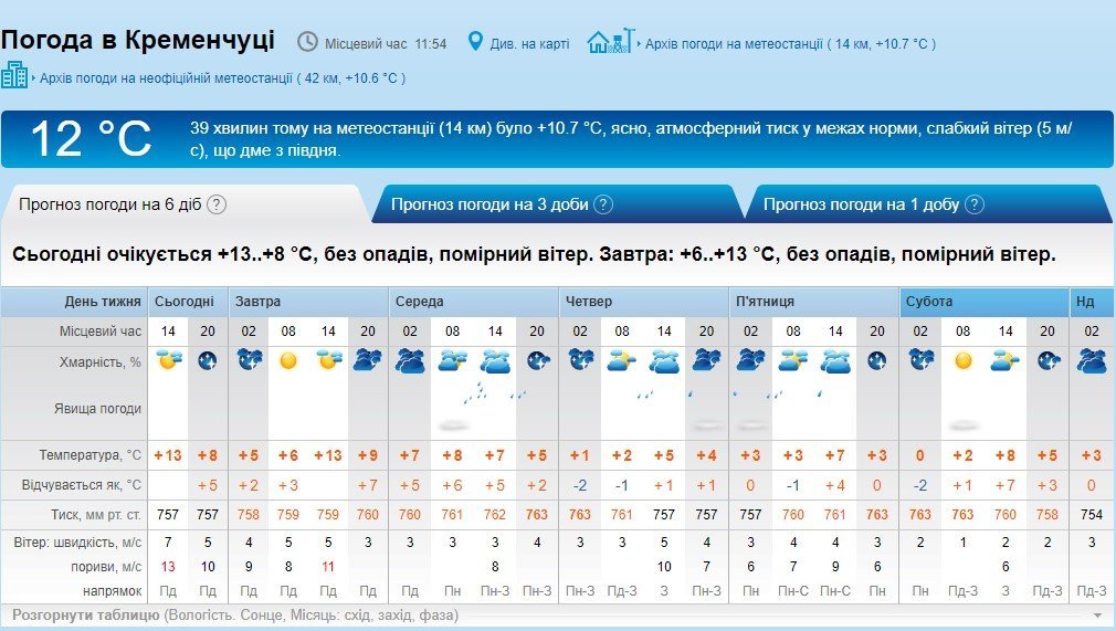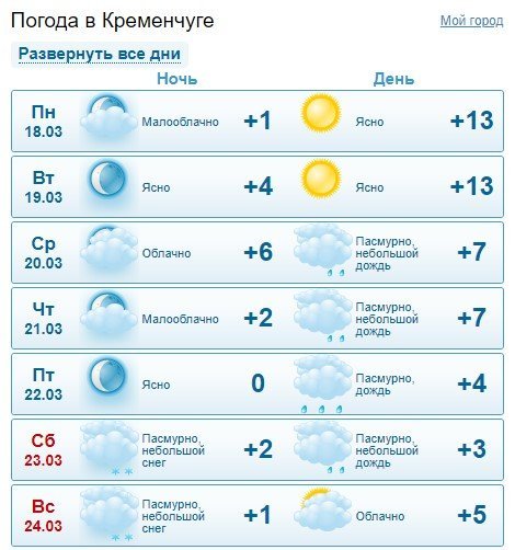 На rp5 крім дощу з середи, 20 березня, по п’ятницю, 22 березня, кременчужан попереджають ще й про пориви вітру до 13 м/с у понеділок-вівторок, 18-19 березня, та ранковий серпанок щодня з середи, 20 березня, по суботу, 23 березня.