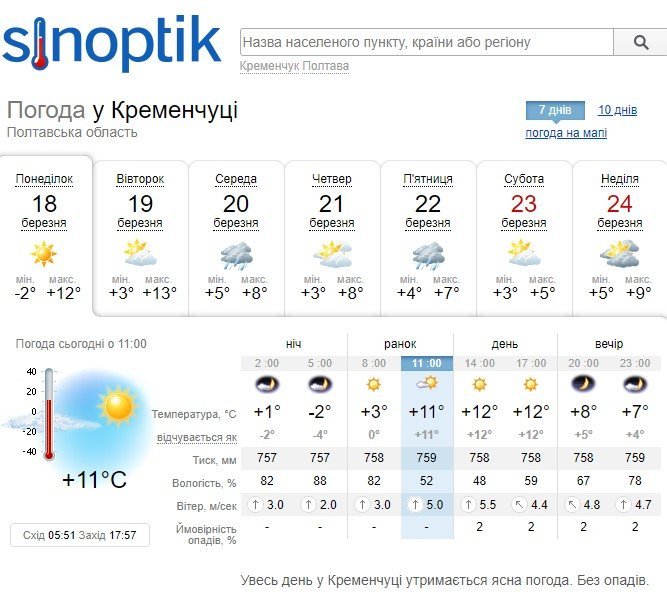 Схожий температурний прогноз і на Sinoptik. Але дощ нам тут обіцяють у середу, 20 березня, та п’ятницю, 22 березня.