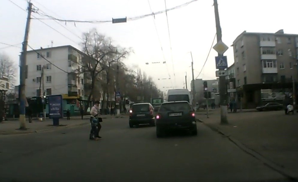 В этот раз в видеорегистратор попала женщина, которая перебегала ул. Первомайскую между остановками общественного транспорта «Рынок» между так называемой «старой» и новой. В 10 метрах от этого места – пешеходный переход со светофорами.
