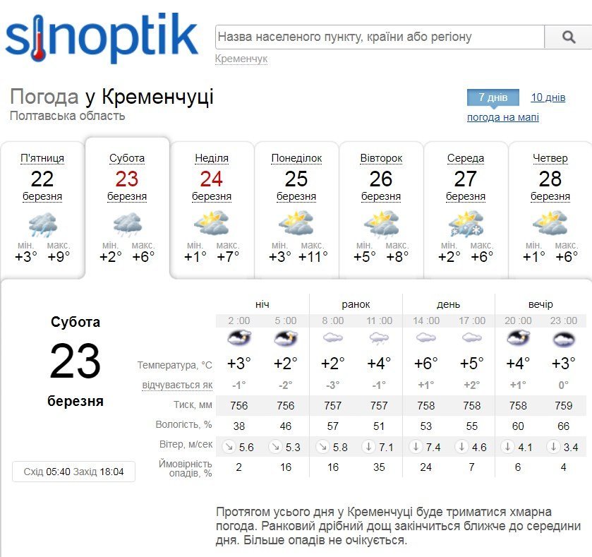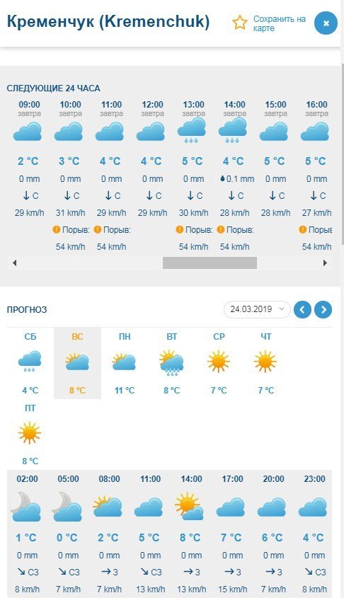 Такой же прогноз и на Gismeteo: дождь днем ??субботы, 23 марта, и сухая погода в воскресенье, 24 марта.