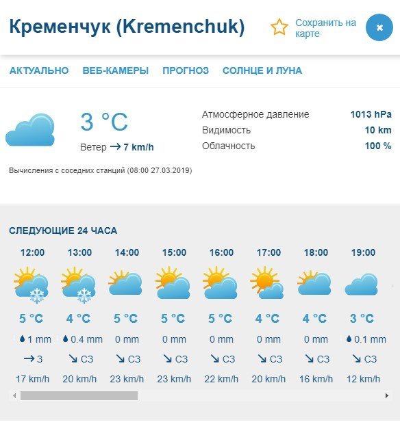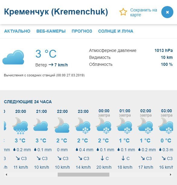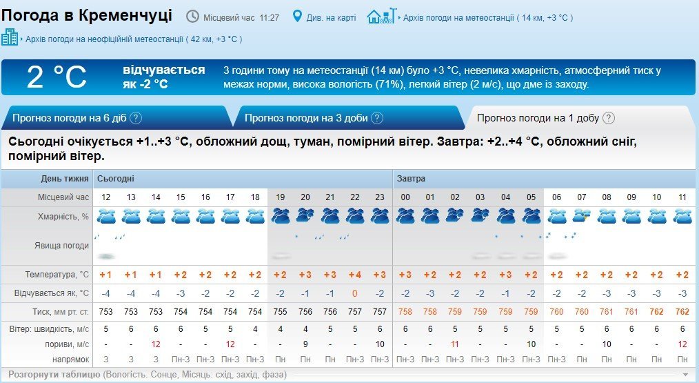 За прогнозом Ventusky, сніг у Кременчуці мав піти уже о 12.00, ввечері можливий дощ, а вночі – знов сніг. Очікувана температура повітря від 0°С до +5°С.
