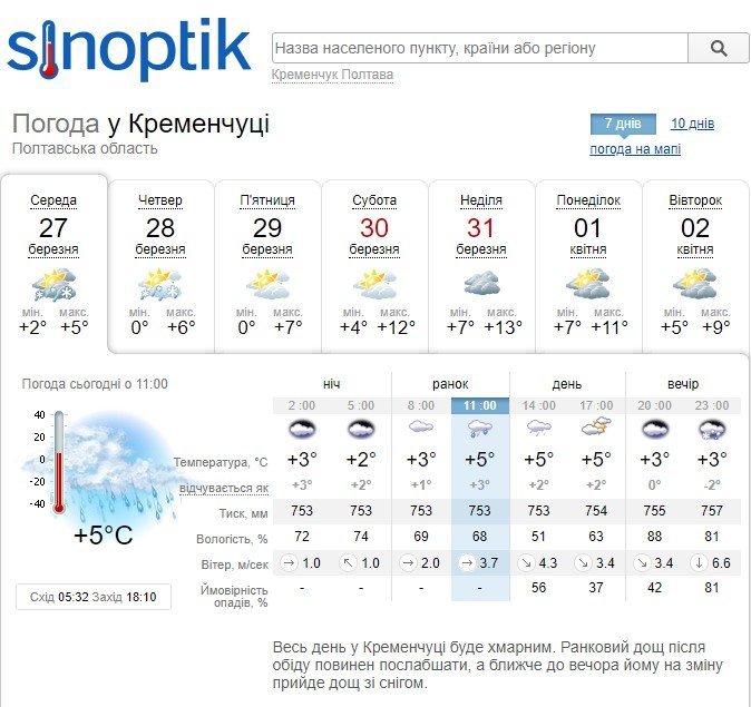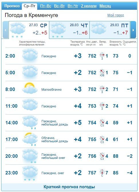 Gismeteo прогнозує кременчужанам дощ з 14.00 до 20.00, а далі – сніг на усю ніч. Температура повітря коливатиметься від +2°С до +5°С. В ніч на четвер, 28 березня, можливий мороз до -1°С.