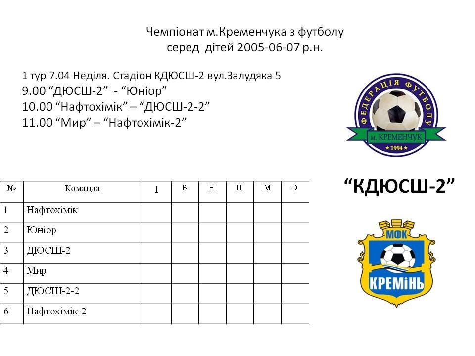 6 квітня на полі КДЮСШ №2 у Кременчуці стартує дитячий чемпіонат з футболу. Змагання проходитимуть серед футболістів 2005-2007 року народження. Змагання триватимуть до 25 травня. Як повідомив «Телеграфу» тренер дитячої команди «Кремінь» Ярослав Здирко, у змаганнях візьмуть участь 6 команд з «Кременя», КДЮСШ №2 та «Нафтохіміка».