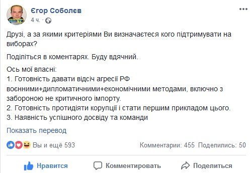 31-го марта состоятся выборы президента Украины. Народный депутат Егор Соболев опубликовал перечень критериев, по которым он будет выбирать президента страны. Они такие: