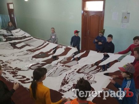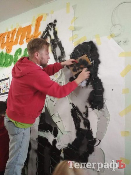- Мені дали різні світлини, я прохав фоткатися по-різному. Мені показали приблизний ескіз з двома хлопцями, але я не можу плагіатити інших авторів, в мене є своя голова на плечах. До того ж там лише двоє людей, а тут можна зробити більше, тим паче це учні школи. Багато хто малює котиків, пейзажі, репродукції інших художників. А сенс? Сенс робити те, що вже було? Треба дати можливість дітям спробувати як воно. Ми спробували. Так, це не так просто, як здавалося. Потрібно ще вирізати, але діти розуміли, що чим швидше вони виріжуть, тим швидше почнуть робити нанесення, а це вже більш цікаво.