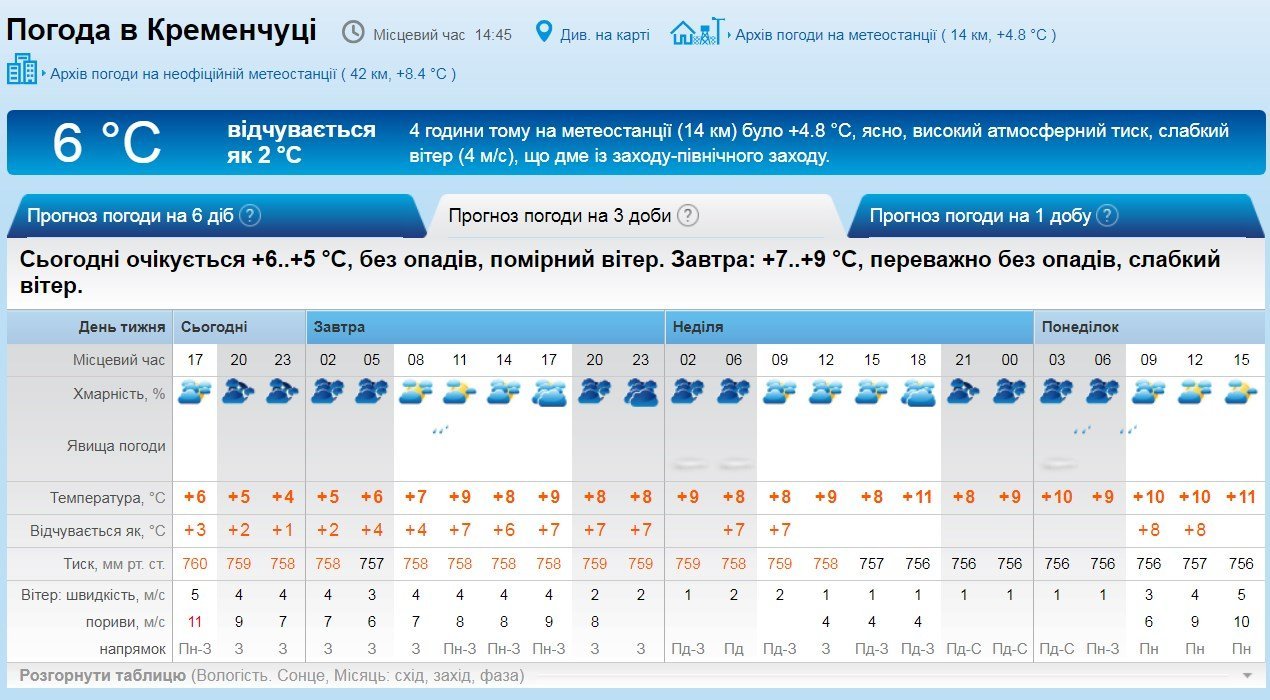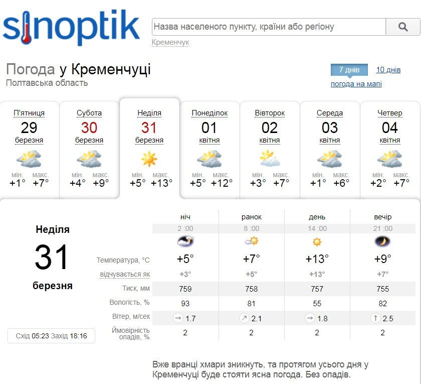 Sinoptik взагалі жодних опадів на вікенд не обіцяє. У суботу, 30 березня, за їх прогнозом, увесь день у Кременчуці буде хмарно, і стовпчики термометрів не здолають позначки у +9°С. А у неділю, 31 березня, небо проясниться, а температура повітря сягне +13°С.