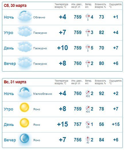 А ось rp5 попереджає про можливий дощ у першій половині суботи, 30 березня, та туман недільним ранком, 31 березня. У суботу не варто чекати, що буде тепліше за +9°С, а у неділю – за +11°С.