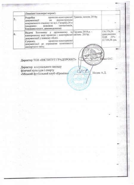 Директор комунального закладу «Міський футбольний клуб «Кремінь» Андрій Недяк уклад додаткову угоду з ТОВ «Інститут градпроект» на розробку проектно-кошторисної документації на реконструкцію комунального стадіону по вулиці Гагаріна. Відповідна додаткова угода опублікована на порталі Рrozorro. Згідно з документацією договір продовжено на місяць - до кінця квітня. Якщо договір не будуть продовжувати, то орієнтовно кременчужани побачать проект реконструкції стадіону на початку травня.