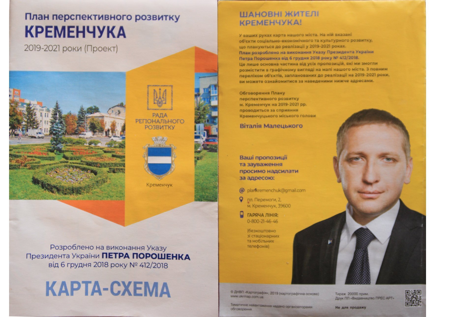 Мэр Кременчуга Виталий Малецкий отказался ответить депутату горсовета Пиддубной, сколько денег ушло на печать его цветных портретов тиражом 20 тысяч экземпляров. Эти портреты украшали обложку Плана перспективного развития Кременчуга на 2019-2021 гг. План был тоже напечатан в цвете.