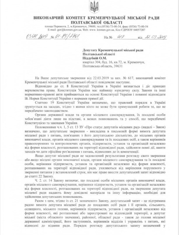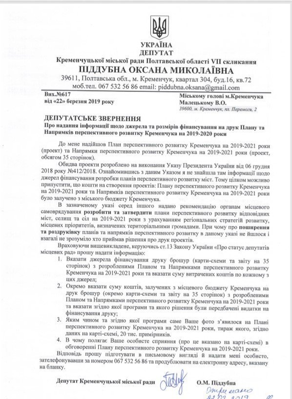 22-го марта депутат Кременчугского горсовета Оксана Пиддубная подала на имя мэра Кременчуга Виталия Малецкого депутатское обращение. Она предлагала чиновнику сообщить: