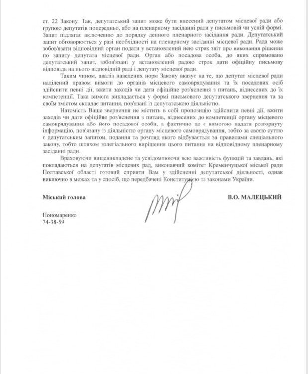 Как видите, вместо ответов на вопросы, мэр (или юристы, готовившие ответ) перечислил на двух страницах различные нормы закона – Конституцию, ЗУ «Про статус депутатів місцевих рад» и др. А после этого сообщил, что депутатское обращение Пиддубной является не обращением, а запросом. И такой запрос нужно выносить на сессию горсовета.