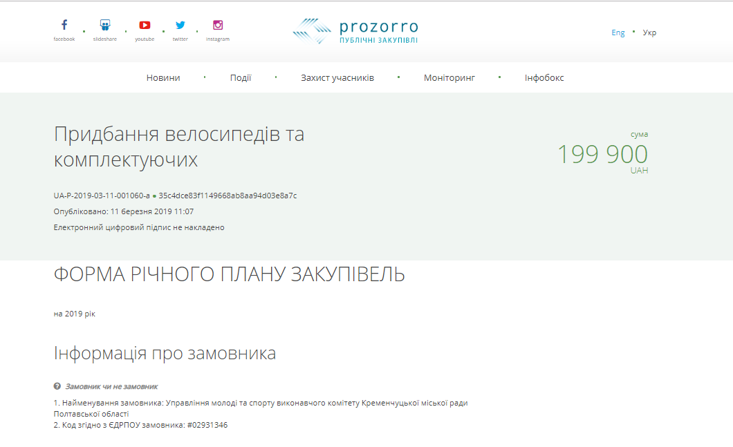 Згідно з інформацією на порталі Prozorro Управління молоді та спорту виконавчого комітету Кременчуцької міської ради придбало велосипеди за 199 900 грн. Оскільки сума закупівлі була нижчою за 200 000 грн велосипеди закупили без проведення тендеру.