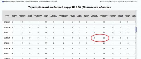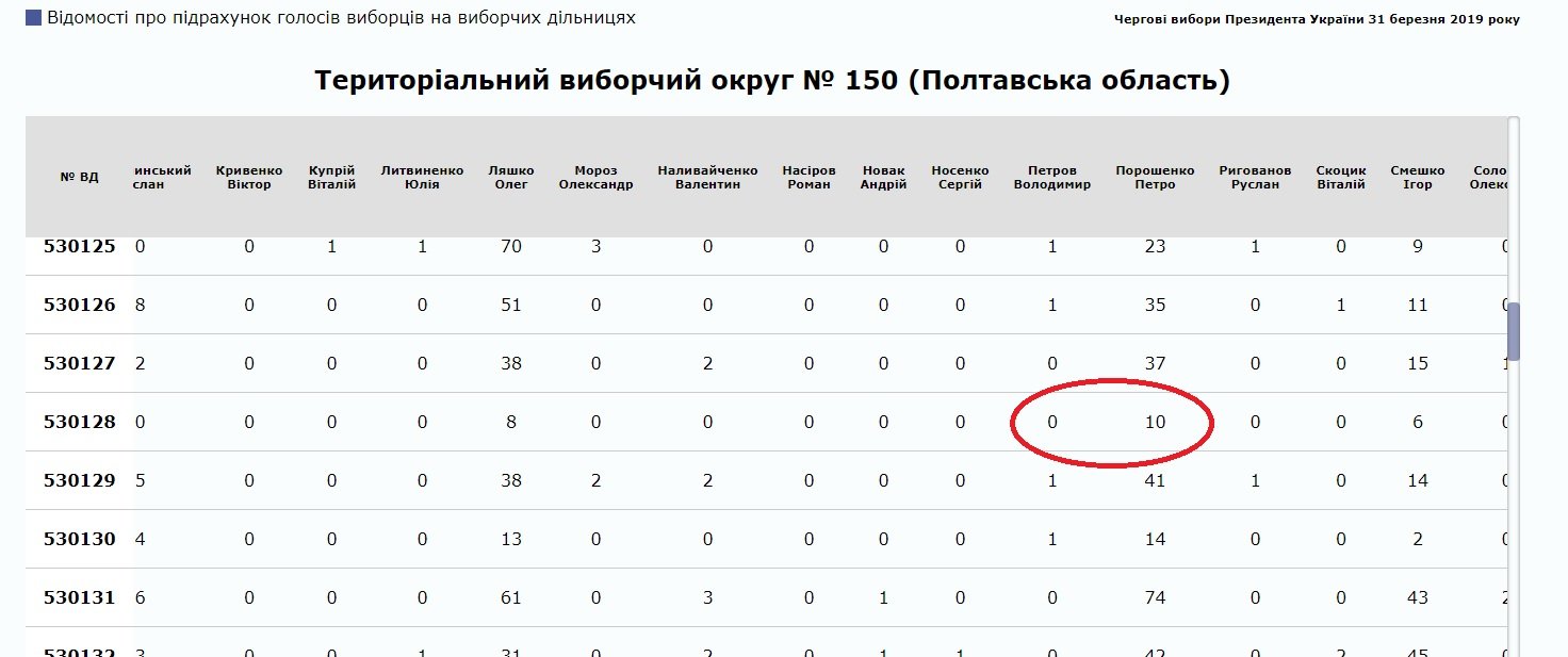 Наразі на сайті ЦВК зазначено, що по ДВК №530128 Петро Порошенко отримав 10 голосів, а Володимир Петров – 0.