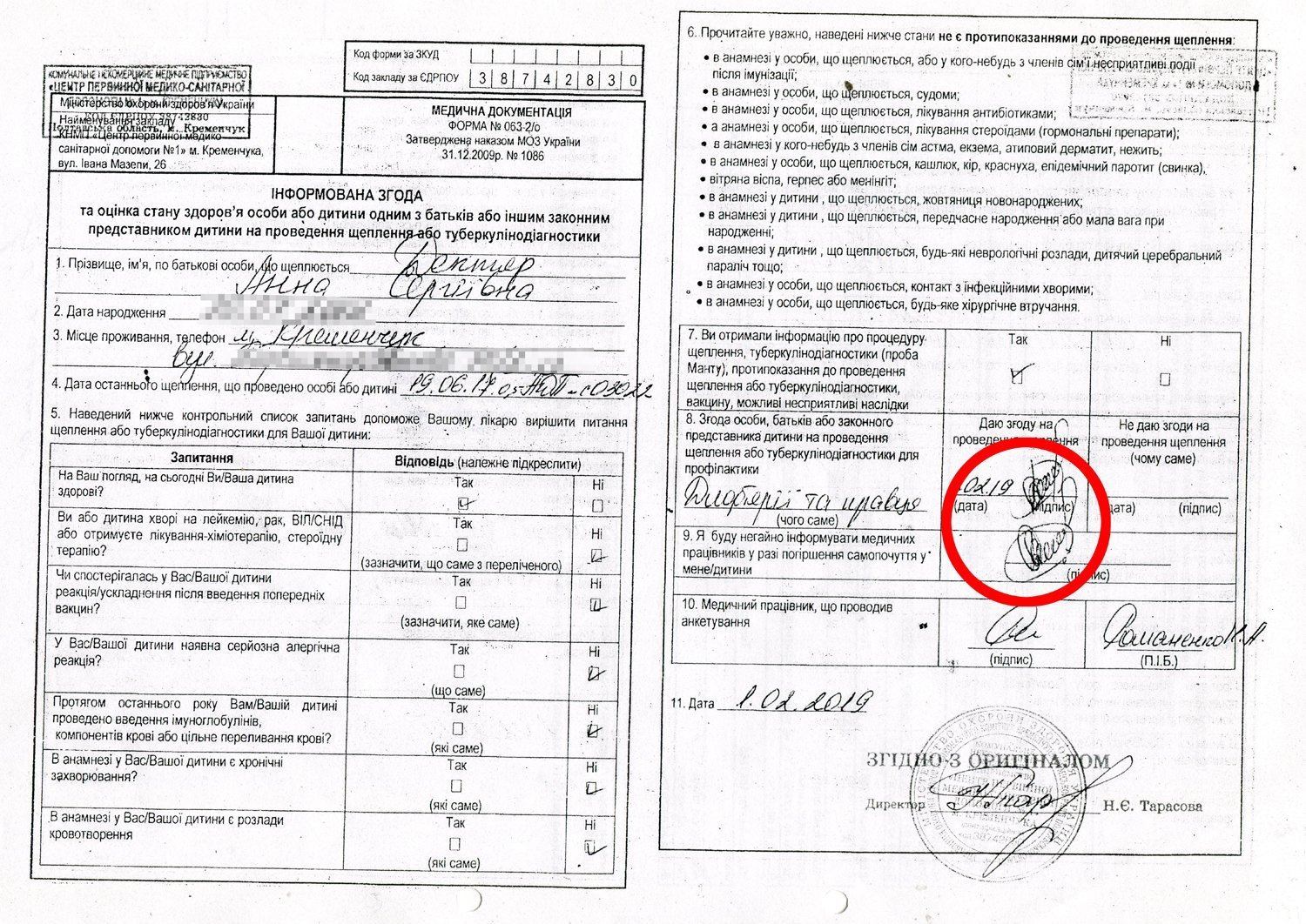 Позже представитель Светланы Дектярь направил запрос в ЦПМСП №1 с целью истребовать копии медицинских документов – в том числе и документ формы №063-2/о – «Інформована згода та оцінка стану здоров’я особи або дитини одним з батьків або іншим законним представником дитини на проведення щеплення або туберкулінодіагностики».