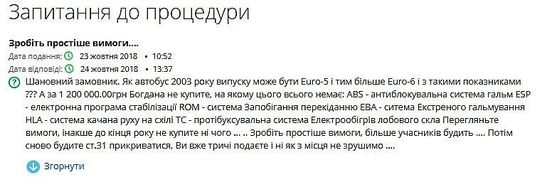Врешті уклали договір на придбання авто Temsa Opalin BG-136Н (MAN), 2005 року на 32 пасажиромісця з об’ємом двигуна 6 870 куб см. Специфікація до договору в ProZorro не розміщена, але, ознайомившись на сайтах продажу авто з подібними пропозиціями, ми (як і потенційні учасники закупівель, що так і не прийшли на тендер) дуже засумнівалися в тому, що авто 2005 року може бути з двигуном «Євро-5». Судячи з сайтів продаж, автобуси цього року випуску йдуть з двигуном «Євро-3».