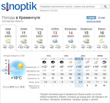 Sinoptik прогнозирует кременчужанам не просто дождь, а настоящую грозу уже сегодня, 10 апреля, вечером, а также в четверг, 12 апреля. В пятницу-субботу, 12-13 апреля возможен небольшой дождь. Температура воздуха днём будет постепенно уменьшаться с +21°С до +11°С.