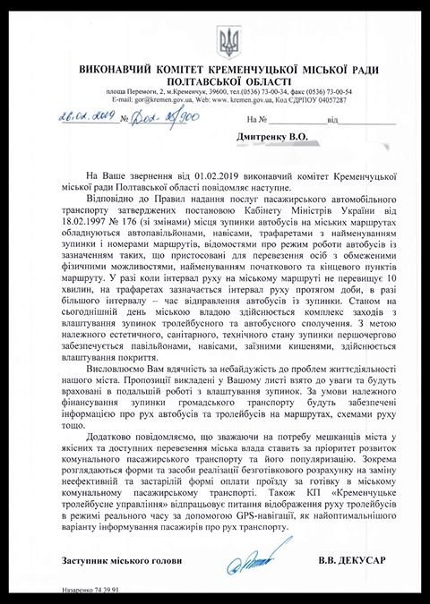 Щодо відповіді на звернення Володимира: з виконкому за підписом заступника міського голови Валерія Декусара надійшла відповідь. У першій частині листа цитують постанову Кабміну №176 «Про затвердження Правил надання послуг пасажирського автомобільного транспорту»: