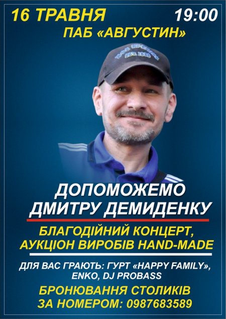 16 травня о 19.00 у Кременчуці відбудеться благодійний вечір на підтримку Дмитра Демиденка. Захд відбудеться в паб «Августин» (ТРК «Європа»). На гостей чекає благодійний аукціон та жива музика. Для вас грають: гурт «Happy family», Enko, DJ Probass.