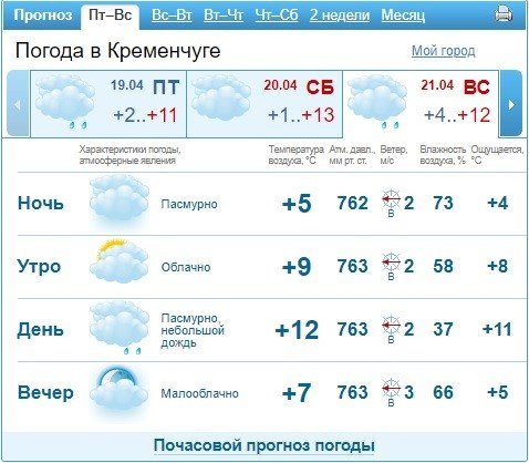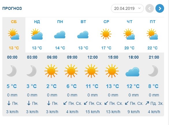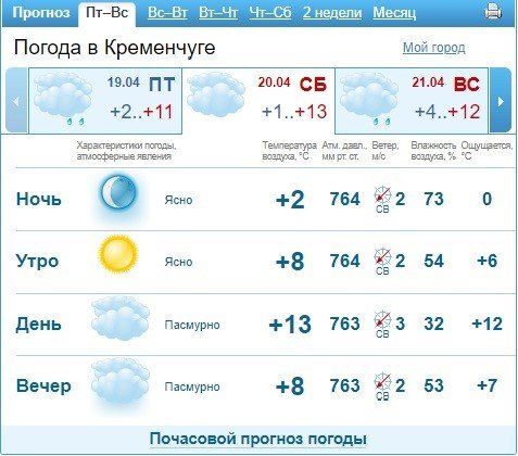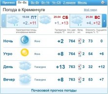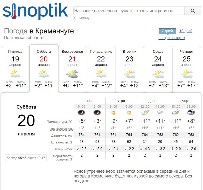 Sinoptik повідомляє, що найхолодніша погода чекає на кременчужан у суботу, 20 квітня — зранку +2°С. У неділю, 21 квітня, трохи потеплішає: стовпчик термометру показуватиме від +6 °С до +11°С протягом дня.
