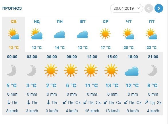 Gismeteo дає схожий прогноз: +2°С у суботу зранку та від +8°С до +12°С протягом вихідних удень. Але на відміну від Sinoptik, який обіцяє лише мінливу хмарність на вихідні, Gismeteo попереджає про можливий дощ у неділю, 21 квітня.