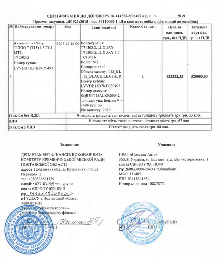 Предмет договору – легковий автомобіль Chery Tiggo 7 або еквівалент. Ціна – 520 тисяч гривень.