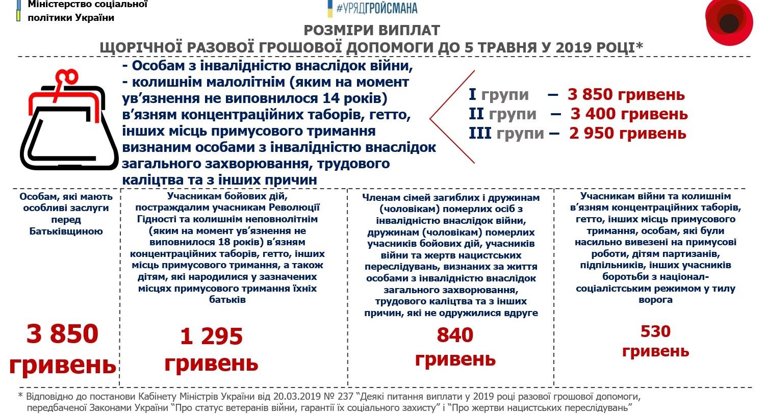 Цього року розмір виплати щорічної разової грошової допомоги до 5 травня у порівнянні з 2017 роком збільшено в середньому на на 200 гривень.