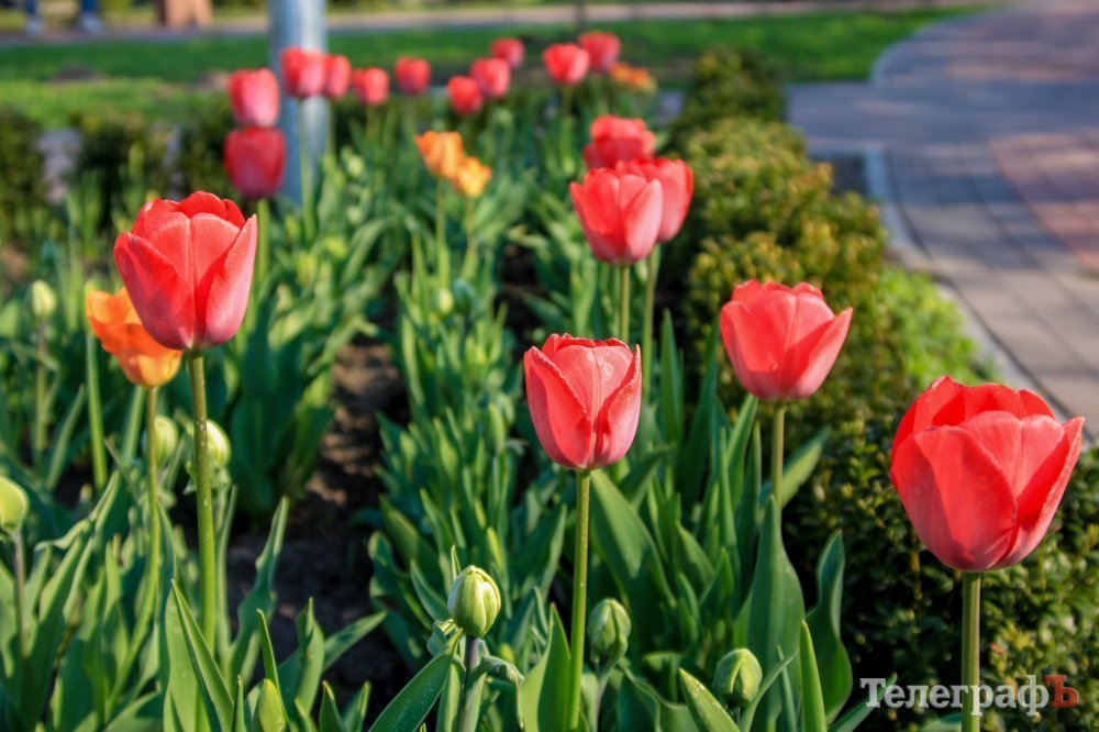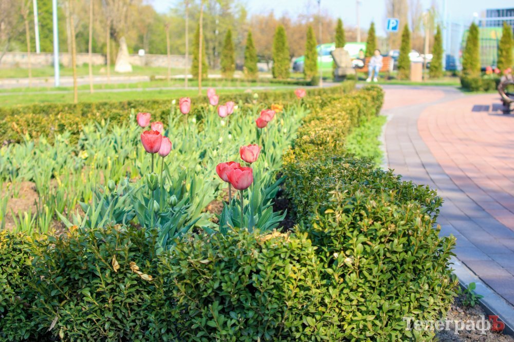 Доріжки з плитки тут перемежовуються з зеленими килимами рослинності, радують око вогняні тюльпани, нарциси, фігурно висаджені кущики самшиту та декоративні дерева.