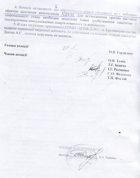 Светлана Дектярь обратилась к депутату горсовета, потому что медицинская комиссия, проводившая в ЦПМСП №1 служебное расследование по факту вакцинации и травмирования Ани, пришла к выводу, что потеря сознания и полученные травмы никак не связаны с вакцинацией. При этом члены комиссии (она состояла из сотрудников ЦПМСП №1) не назвали причину потери сознания пациенткой.