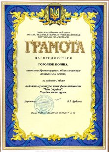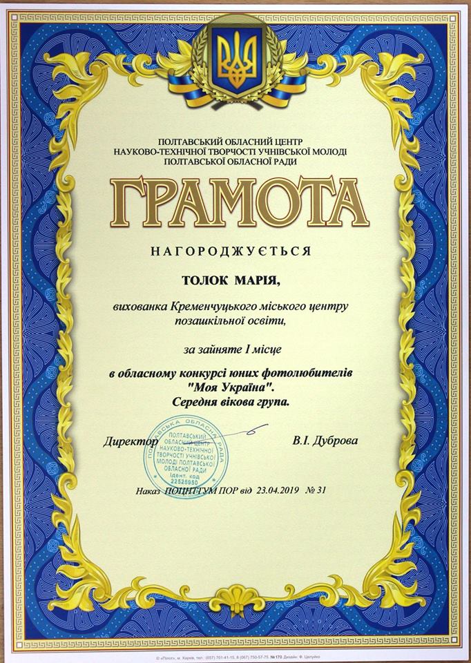 Дві кременчужанки перемогли на обласному фотоконкурсі, повідомляють в Департаменті освіти Кременчука. Конкурс «Моя Україна» відбувся 23 квітня на базі Полтавського обласного центра науково-технічної творчості учнівської молоді. Участь у ньому взяли участь 36 дітей.