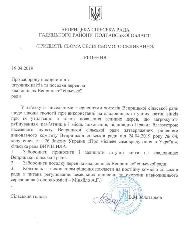 У селі Веприк Гадяцького району заборонили нести на цвинтар і залишати там штучні квіти. Таке рішення ухвалили депутати на 37-й сесії Веприцької сільської ради.