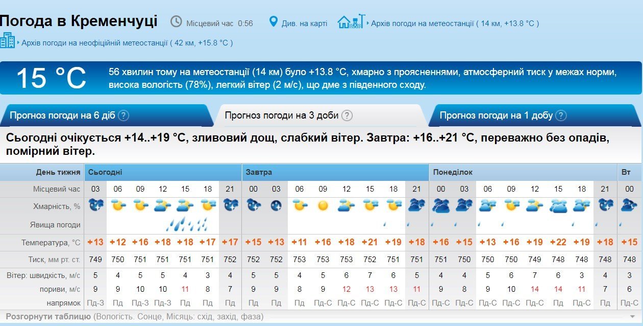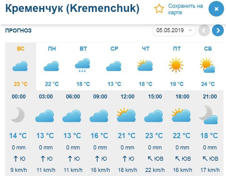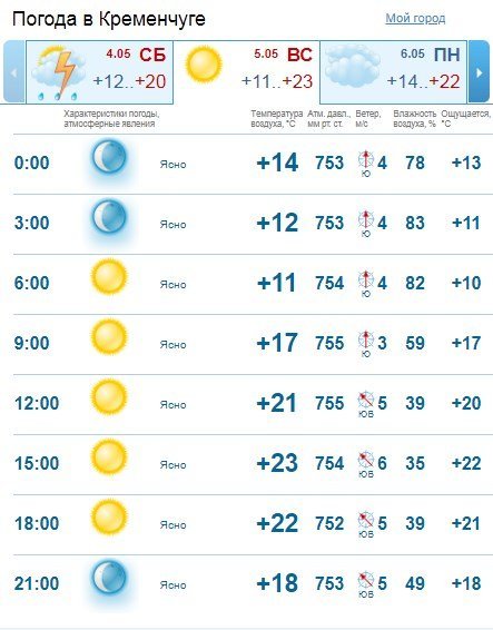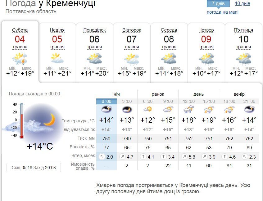 За даними Sinoptik, у суботу, 4 травня у Кременчуці хмарна погода протримається у Кременчуці увесь день, а усю другу половину дня йтиме дощ із грозою. Повітря прогріється до +19°С. У неділю, 5 травня, також буде хмарно, але опадів не прогнозують. Температура повітря сягне +21°С.