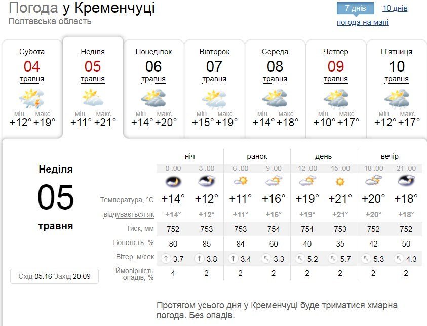 За прогнозом rp5, грози чекати не варто, але у суботу, 4 травня, під вечір йтиме сильна злива, а пориви вітру сягнуть 11 м/с. Повітря не прогріється більше, ніж до +18°С. У неділю, 5 травня, ввечері також накрапатиме, а вітрюган посилиться до 13 м/с.