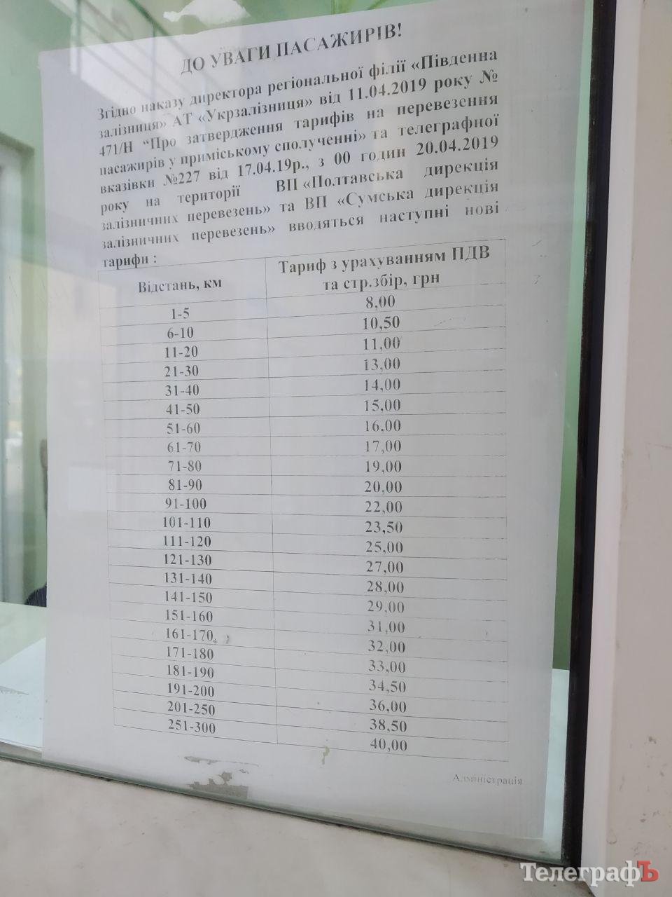 Згідно з інформацією, що є на сайті «Укрзалізниці», з 20 квітня 2019 року на території Полтавської та Сумської дирекції залізничних перевезень (Сумська, Полтавська, Чернігівська області) діють нові тарифи на проїзд у приміському залізничному транспорті. Тепер проїзд від одного до п'яти кілометрів коштує 8 гривень. Раніше, з 26 січня 2018 року, відповідно до даних на сайті Південної залізниці, відстань від 1 до 5 км «коштувала» 5 гривень. Тож вартість проїзду підвищилася на 60%.