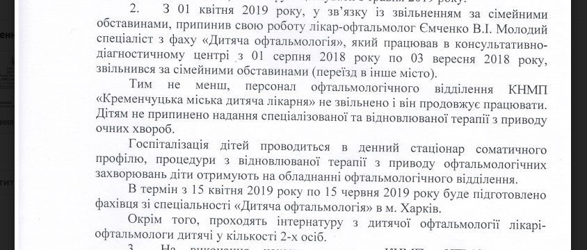 Кременчугский исполком обещает, что во второй половине июня 2019-го в Кременчугской городской детской больнице появится детский врач-офтальмолог.