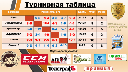 Хокеїсти «Кременчука» перемогли «Сокіл-2» з рахунком – 4:1, але поступилися «Соколу» (5:7), «Гладіатору» (10:4), «Барс» (3:4), СДЮШОР (4:0).