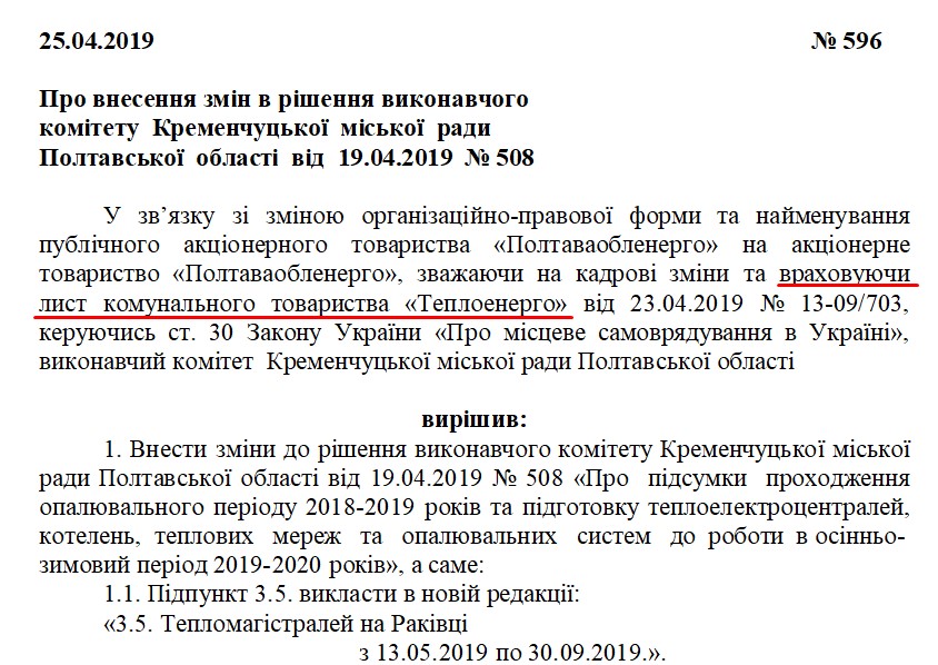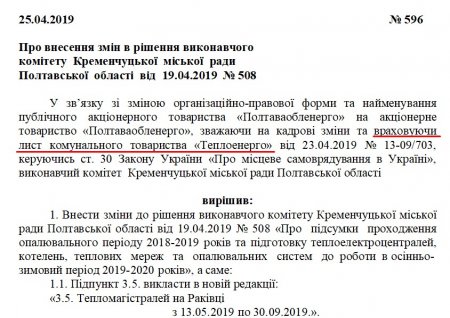 Близько 13.30 на сайті мерії Кременчука з'явилося повідомлення про те, що рішення про перенесення строків початку ремонтних робіт на Раківці було ухвалене 25 квітня (завантажити рішення: ). Причиною внесення змін став лист «Теплоенерго».