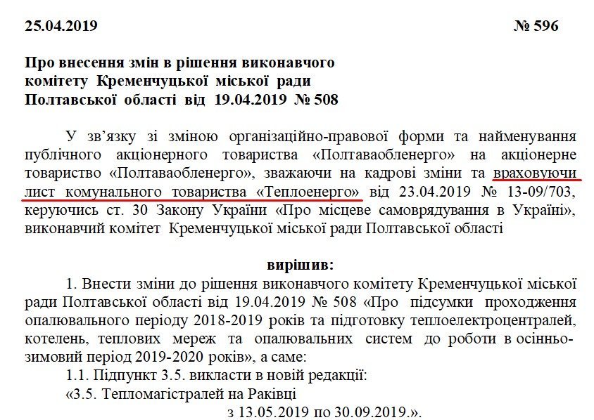 Близько 13.30 на сайті мерії Кременчука з’явилося повідомлення про те, що рішення про перенесення строків початку ремонтних робіт на Раківці було ухвалене 25 квітня (завантажити рішення:[attachment=609]). Причиною внесення змін став лист «Теплоенерго».