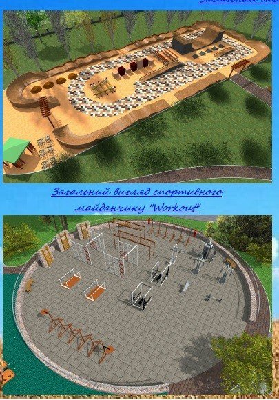 - другу зону облаштують спортивним інвентарем та тренажерами для вуличної гімнастики street-workout;