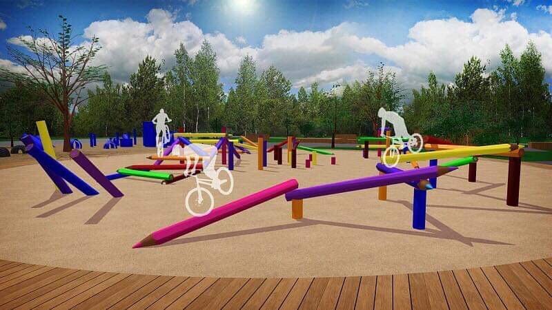 - перша зона — це памп-трек та комплексний майданчик з набором штучних перешкод для тренувань любителів велосипедів, самокатів, роликів та біговелів;